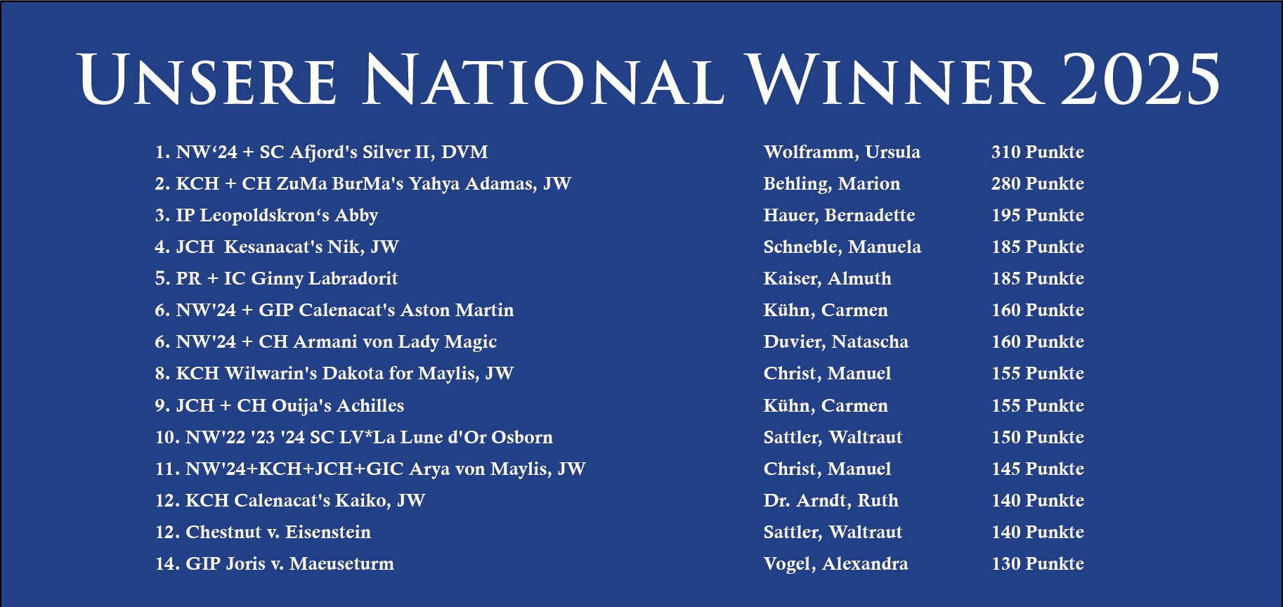 Zu unserem großen Bedauern müssen wir leider mitteilen, dass wir bei der Vergabe der National Winner 2025 gegen die FIFe-Richtlinien verstossen haben. Der 1. DEKZV e.V. hat 24 Titel vergeben, zulässig sind jedoch nur 15 Titel.